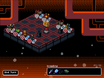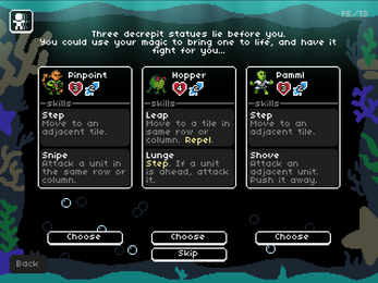 The other big thing I noticed was that there's no reward for battles, so there's no reason you would ever pick a battle over another kind of reward, but battles appear next to other rewards as an option sometimes. It also seems to be random whether you get offered rewards or not; I got 4 rewards total over the entire game: 1 attack up, one additional character, and two moves. I was also offered one health up and 1 additional character at the same time as the damage up and previously mentioned additional character respectively. This was more than sufficient to make every level a cakewalk with the current AI, but it did feel a little disappointing due to the infrequency of team-construction decisions.